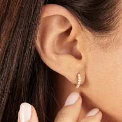 These stunning diamond style pearl drop hoop earrings in 18ct gold plated sterling silver can be dressed up or down with removable pearls. Featuring a row of baguette crystals, these earrings are the perfect wedding day jewellery for a bride or bridesmaids to wear as they complement any outfit.Â