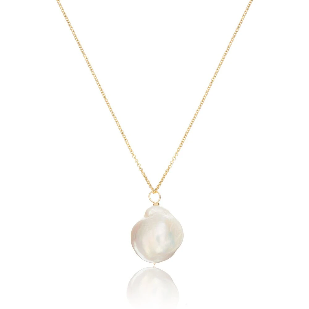 Lily & Roo’s gold genuine freshwater large baroque pearl necklace is the perfect statement piece and comes on a gold chain. Baroque pearls are pearls with an irregular non-spherical shape, these are some of the most fascinating organic gems you can find.