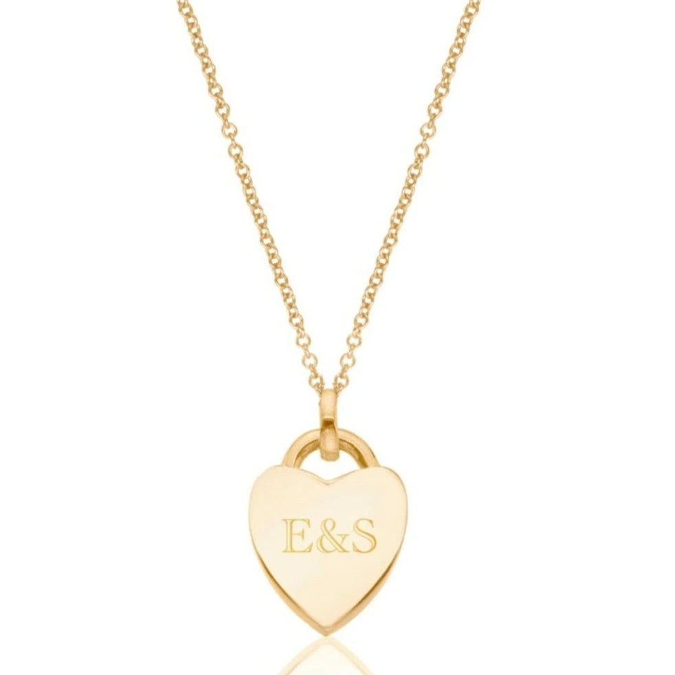 Our gold heart padlock pendant necklace is the perfect gift for someone special. Worn as a symbol of love, the heart padlock pendant is ideal for everyday wear to commemorate that special occasion. Engrave up to 3 characters on either side of the pendant. Choose from five different font options shown in the font selection image.Â