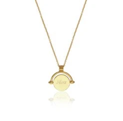 Our gold mother of pearl spinning disc with an engravable reverse is a truly stunning piece of jewellery. Engrave up to 25 characters in one of our five different fonts on the reverse. This spinning disc necklace is made of solid sterling silver plated in 18ct gold and features genuine mother of pearl. Perfect for layering but is just as stunning when worn alone.