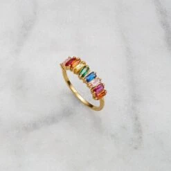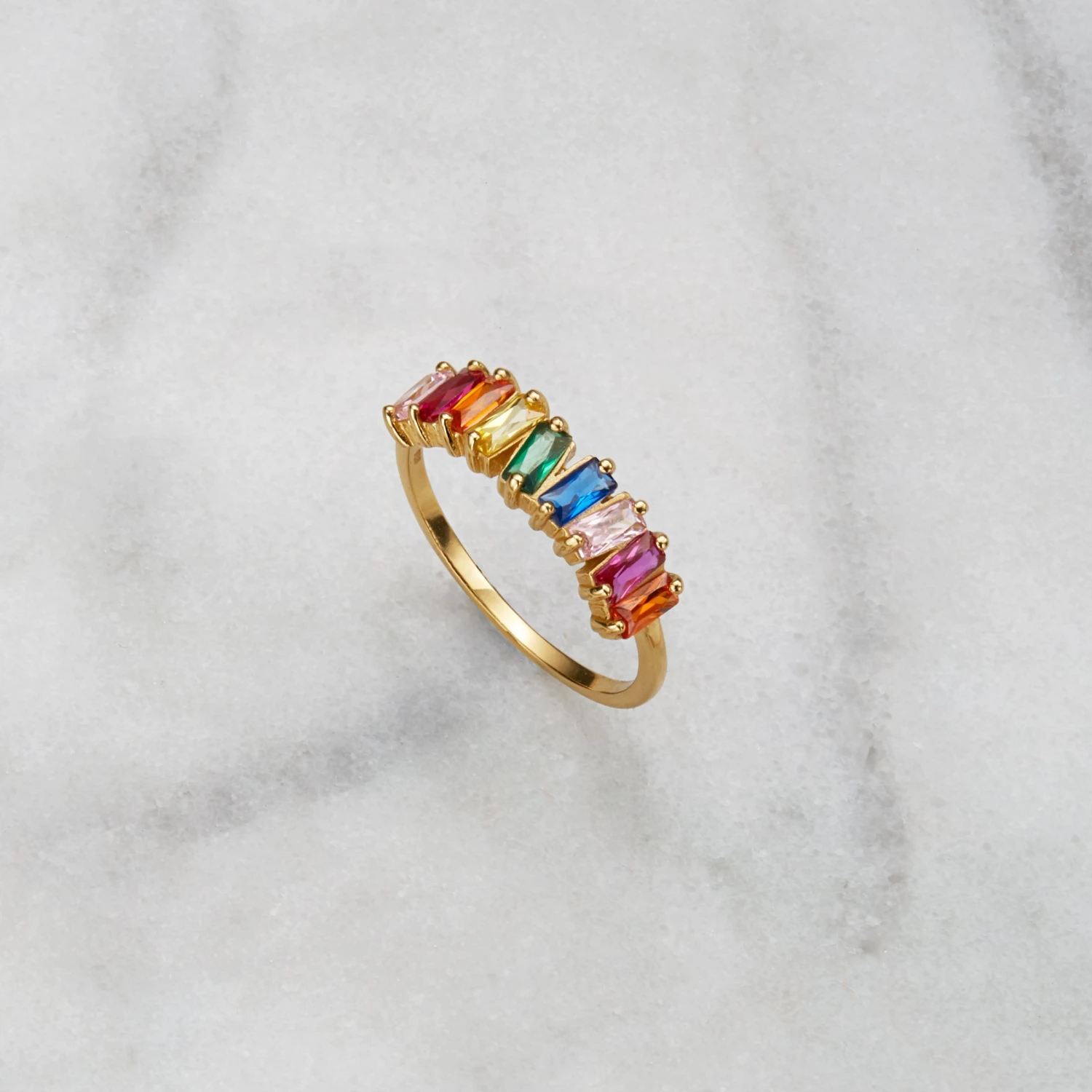 Our beautiful gold rainbow gemstone rings have just the right amount of sparkle for any hand. Available in three sizes, small (K), Medium (M) or Large (P) and featuring a row of nine gemstones, this cluster rainbow ring is the perfect jewellery gift for any woman. You can wear this piece of jewellery alone or for maximum impact, with our matching rainbow huggie hoop earrings and bracelet. Made with solid sterling silver and a thick layer of 18ct gold.