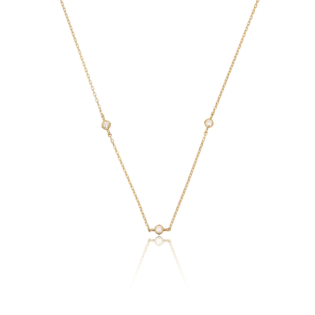 Our classic gold three diamond style necklace is an essential piece for the minimalist look. Featuring three individually set crystals and an extendable chain that fits 16 inches (41cm) to 18 inches (46cm). Pair with our three diamond style bracelet to complete the look.