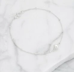 This rose gold single satellite pearl bracelet can be worn by a bride on her wedding day but compliments almost any outfit. Handmade in our London studio, this single pearl satellite chain bracelet includes a genuine freshwater pearl and is available in gold or silver.