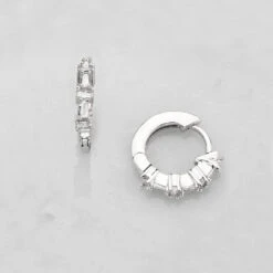 Our stylish, solid sterling silver baguette diamond style huggie hoop earrings are designed to hug your earlobe and to be put on with ease. Small huggie hoop earrings are the perfect everyday-wear and work with any outfit, from casual-wear to a proud bride wearing them on her wedding day.