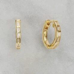 These stunning baguette diamond style medium hoop earrings in solid sterling silver have a classic, subtle style to them. Featuring a row of baguette crystals, these earrings are the perfect wedding day jewellery for a bride or bridesmaids to wear as they complement any outfit.Â
