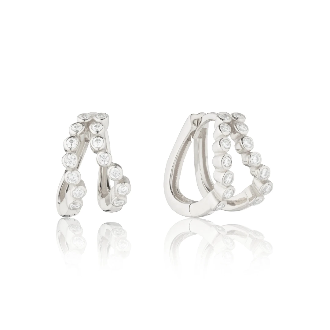 Our stylish silver double wave diamond style huggie hoops earrings are a modern twist on the classic huggie hoops. Featuring two wave hoops, covered in individually set crystals. These sparkling hoops give the illusion of wearing two huggie hoops at once and are the perfect addition to any outfit.
