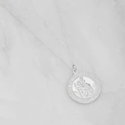 Our beautiful solid sterling silver large St Christopher medallion necklace is suitable for everyday wear and perfect for layering. The round medallion pendant is the perfect piece to mark any special occasion. Make it extra special with our in house engraving. Engrave up to 30 characters on the reverse and choose from five different font options shown in the font selection image. Please note depending on engraving length characters may be shown over several lines.