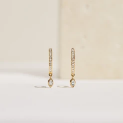Our beautiful silver marquise diamond drop hoop earrings can be worn every day or saved for a special occasion, such as a wedding or evening party. Pair them with our matching diamond-style marquise necklace and bracelet to complete the look. These hoop earrings are made with a hinge to be put on with ease, featuring a row of pavé set diamonds or crystals and a marquise diamond or crystal drop that subtly moves and shimmers in the light.