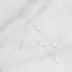 Our delicate solid sterling silver mini pearl ear threaders are the perfect addition to any outfit. Handmade in our London studio using genuine freshwater pearls, these earrings are a unique accessory for any bride and her bridesmaids. Designed to be worn with ease, you can adjust the length of these threaders for a truly unique look. Our threader earrings come with a pair of clear silicone backs to adjust the length and keep them in place.Â