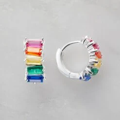 Our silver small rainbow huggie hoop earrings are designed to gently hug the earlobe and give off a stunning sparkle. You can wear these on their own, or with the matching rainbow gemstone ring and bracelet. Featuring a hinge to be put on with ease and made of solid sterling silver, these huggie hoops give just the right amount of colour.