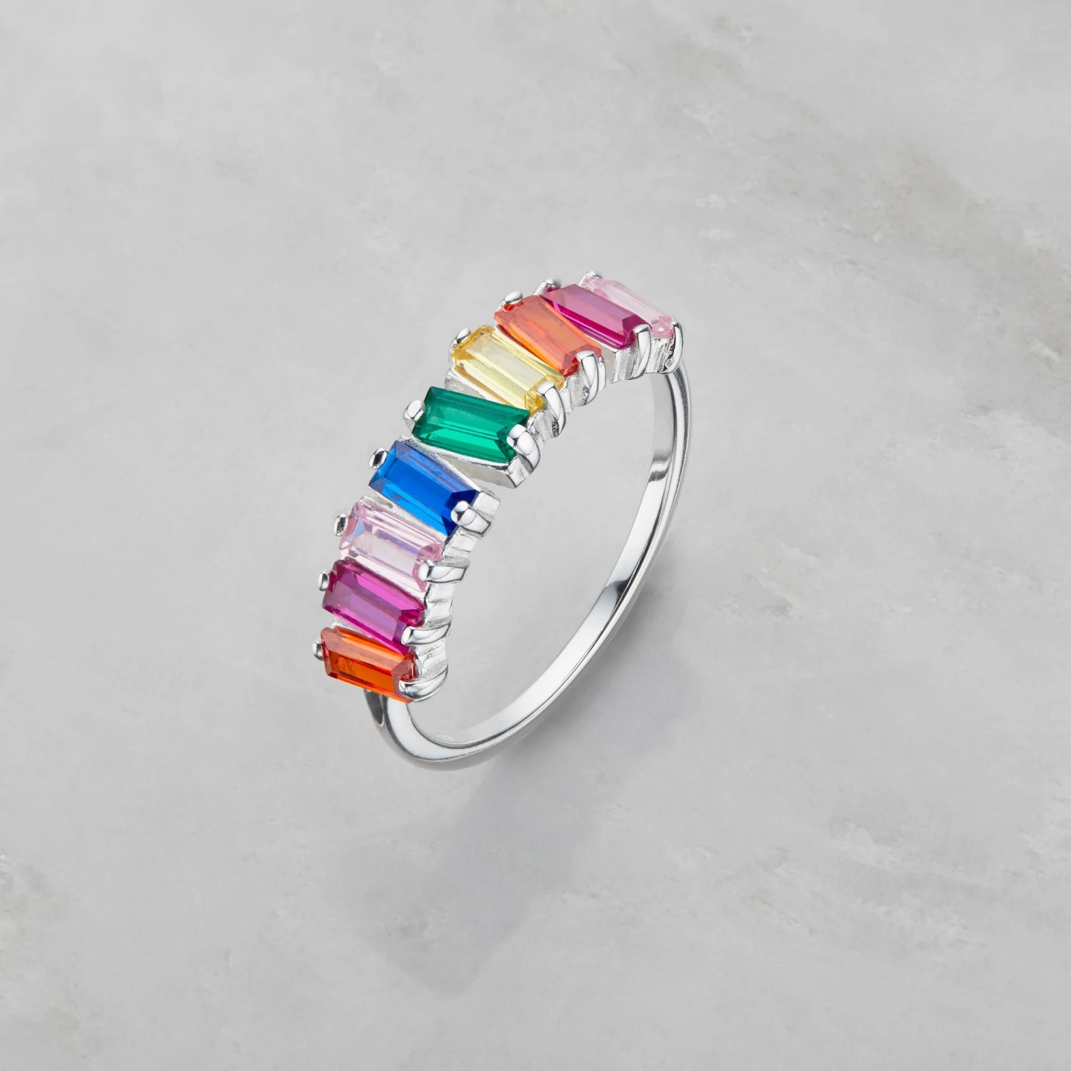Our beautiful silver rainbow gemstone rings have just the right amount of sparkle for any hand. Available in three sizes, small (K), Medium (M) or Large (P) and featuring a row of nine gemstones, this cluster rainbow ring is the perfect jewellery gift for any lady. Wear alone or for maximum impact, with our matching rainbow huggie hoop earrings and bracelet. Made with solid sterling silver.Â
