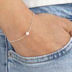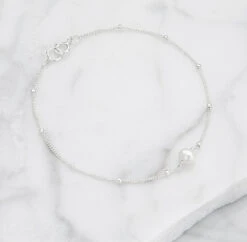 This solid sterling silver single satellite pearl bracelet can be worn by a bride on her wedding day but compliments almost any outfit. Handmade in our London studio, this single pearl satellite chain bracelet includes a genuine freshwater pearl and is available in gold or silver.