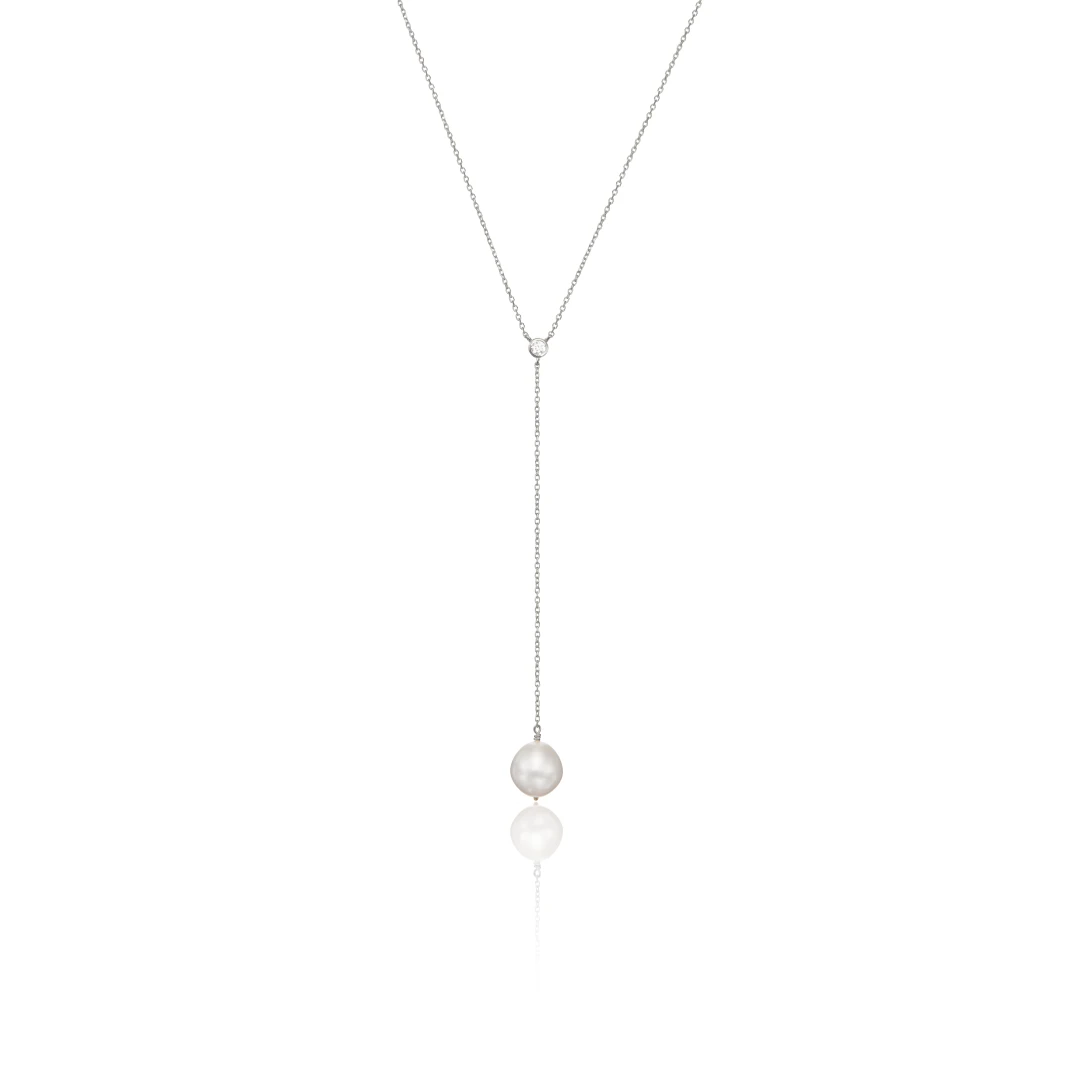 Our beautiful silver single diamond pearl lariat necklace is an elegant accessory for any bride’s big day. Featuring a large freshwater pearl and pavé set crystal that subtly moves and shimmers in the light.