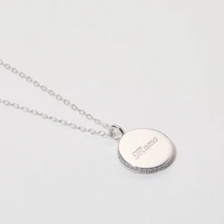 Lily & Roo’s solid sterling silver diamond style disc necklace: the perfect personalised jewellery gift to complement any outfit! Our personalised disc necklace features a row of crystals set around the edge of the piece, for a touch of subtle luxury. Choose between your loved one’s name, initials or even a special date to be engraved on either side of this pave-set pendant.Â