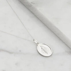 Our beautiful solid sterling silver Virgin Mary Necklace, also known as a Miraculous Medal is suitable for everyday wear and is perfect for layering. The silver oval pendant features the Virgin Mary in all her perfect beauty. This solid sterling silver Virgin Mary necklace has a deep meaning and will last for generations to come.