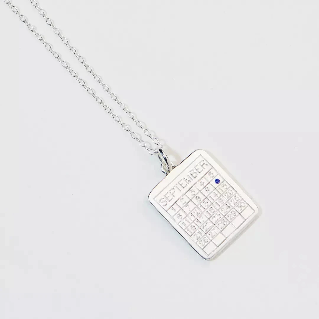 Our beautiful silver special date calendar necklace is set with your choice of gemstone to mark your memorable day. This one of a kind sentimental piece comes complete with a ‘find your meaning’ gemstone card and luxury gift box.